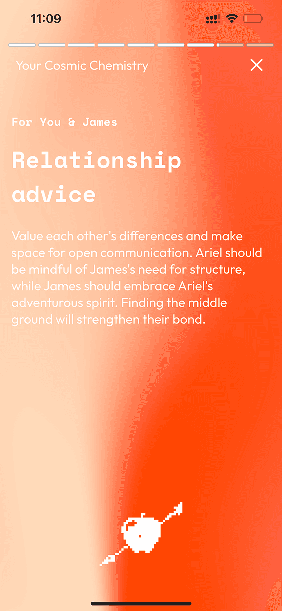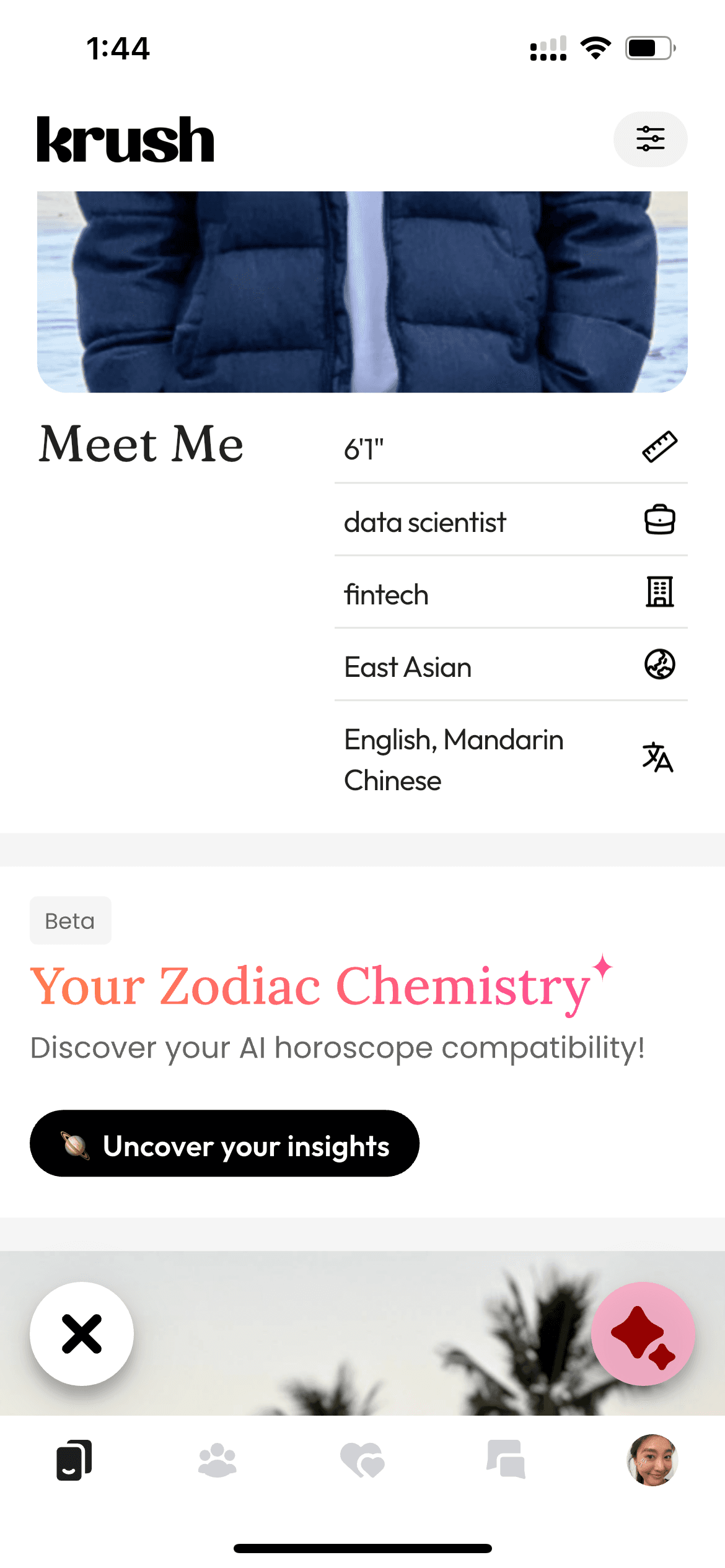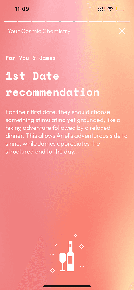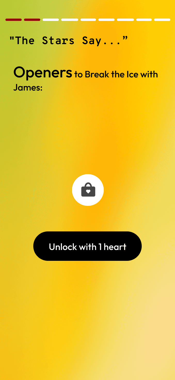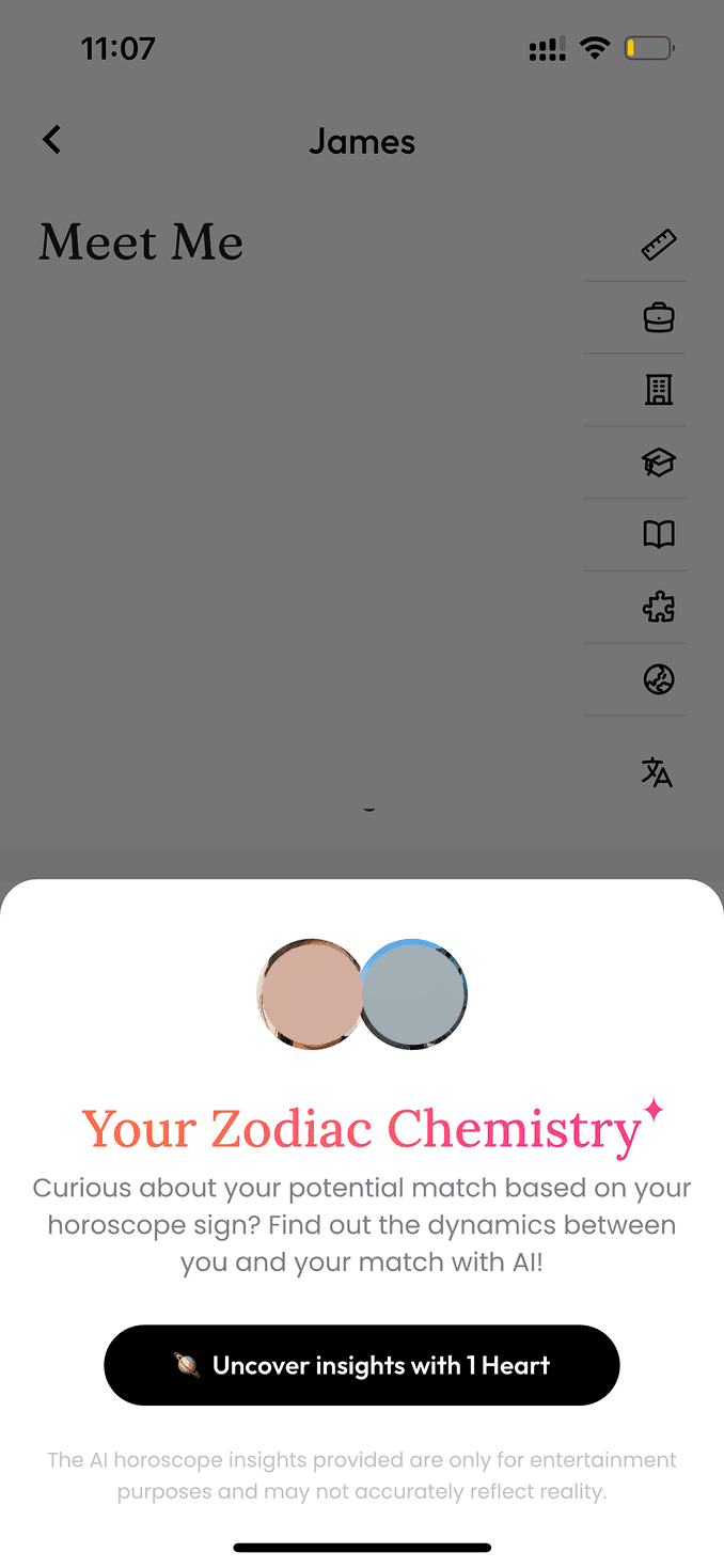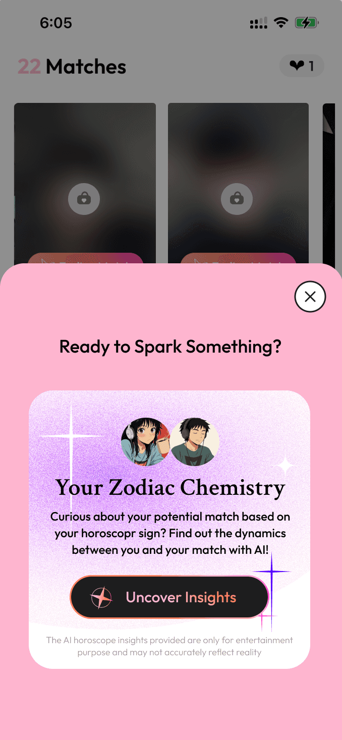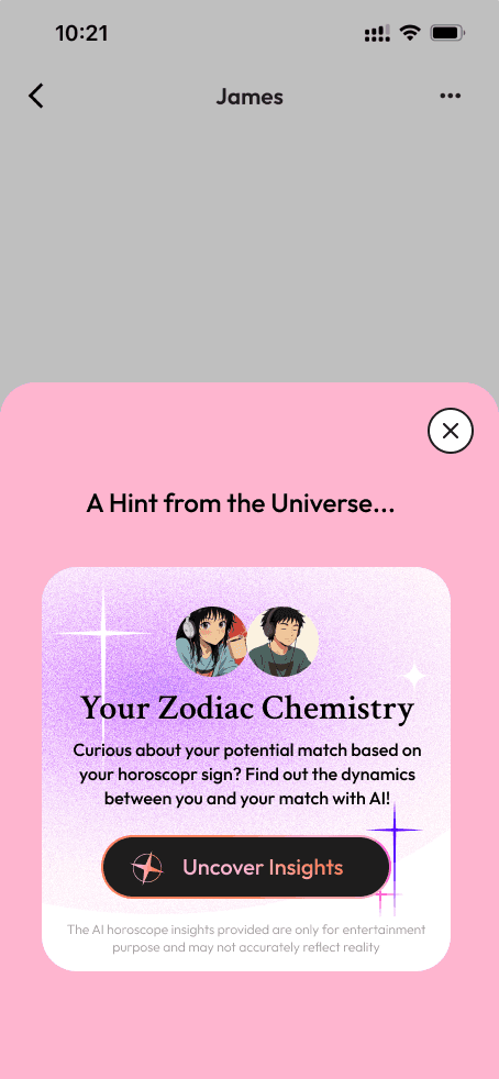 “Need a way to break the ice? Tap to reveal your zodiac chemistry.”This approach aligns with how users naturally think about fate and chemistry—as an add-on, not a filter